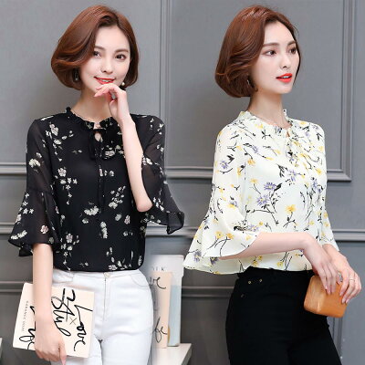 シフォン ブラウス レディース 半袖 トップス フレアスリーブ ポリエステル 花柄 秋冬 大人気